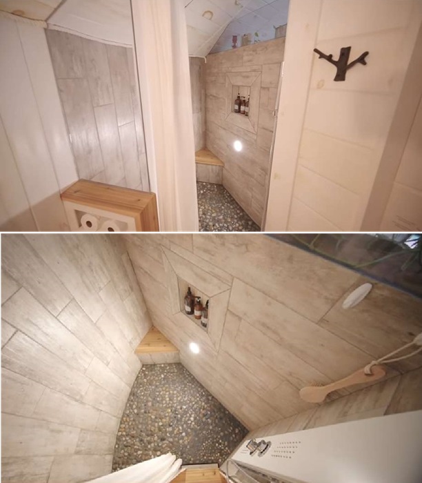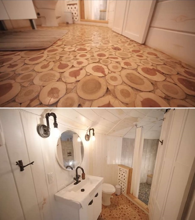 Пространство второго уровня между собой делит спальня и благоустроенная ванная комната, главной изюминкой которой стало эффектное напольное покрытие, сделанное из плотно уложенных срезов из древесины. Чтобы сохранить структуру дерева и продлить его срок эксплуатации, пол залили несколькими слоями эпоксидной смолы. В душевой на полу уложена галька, закрепленная раствором цемента, так что оригинальность дизайна затронули все уголки. Ну а в остальном ванная комната имеет традиционный набор оборудования и удобств. Правда, форма душевой имеет совсем непривычные формы, да и изобретательность супругов приятно удивила наличием шкафа, который помог пристроить массу косметических и моющих средств, а также аптечку.