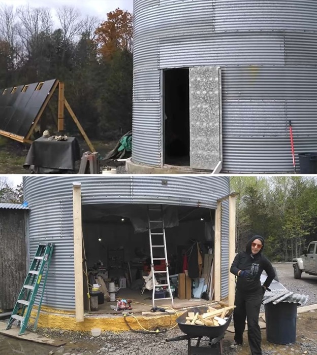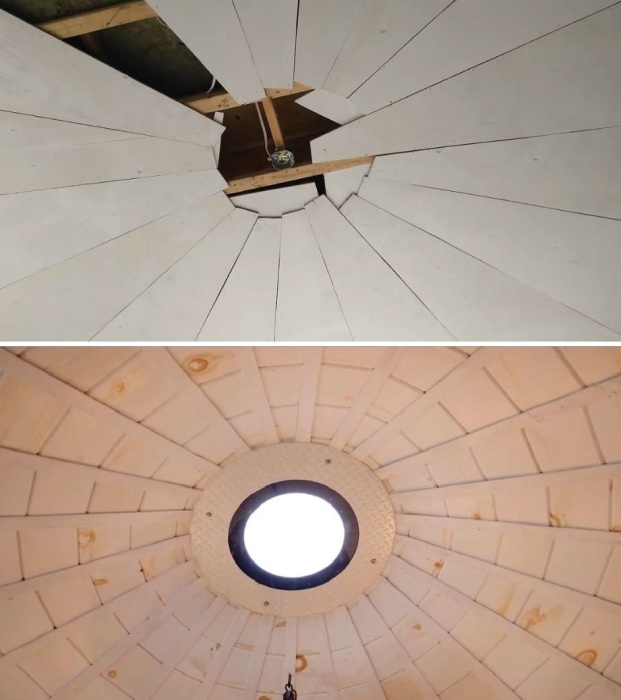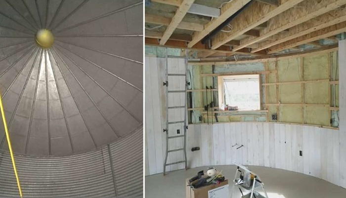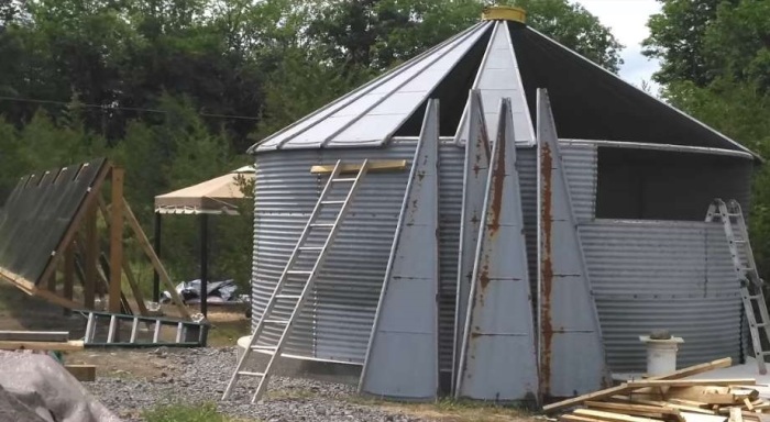По сведения редакции Novate.ru, последним их вдохновением стало старое зернохранилище, изготовленное из гофрированной оцинкованной стали, построенное в виде довольно объемной силосной башни цилиндрической формы. Продавец заранее разрезал зернохранилище на несколько сегментов, так что пара без проблем доставила на свой участок неожиданную покупку. К этому времени они уже подготовили бетонную площадку, состоящую из нескольких слоев щебня и песка, в которые проложили дренажную систему, подвели все коммуникации, включая укладку системы «теплый пол», а затем залили все бетоном. Он и стал фундаментом для будущего дома, и отопительным элементом одновременно. С помощью друзей конструкцию собрали и немного подняли, чтобы удалось разделить пространство на два уровня. В итоге получилась структура диаметром 5,8 метра с высотой в центре 6,1 м (силос с крышей имеет коническую форму).