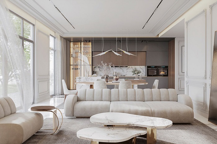 Чтобы создать интерьер в таком стиле, выбирайте золотой, черный, серо-голубой, белый цвета. Отличным дополнением комнат станут мраморные столешницы, зеркала в массивных винтажных рамах, лепнина в комбинации с лаконичными формами и линиями. Мебель должна быть современной, но с намеком на классику. Например, можно выбрать диван на изогнутых ножках, кресло с бархатной или велюровой обивкой.