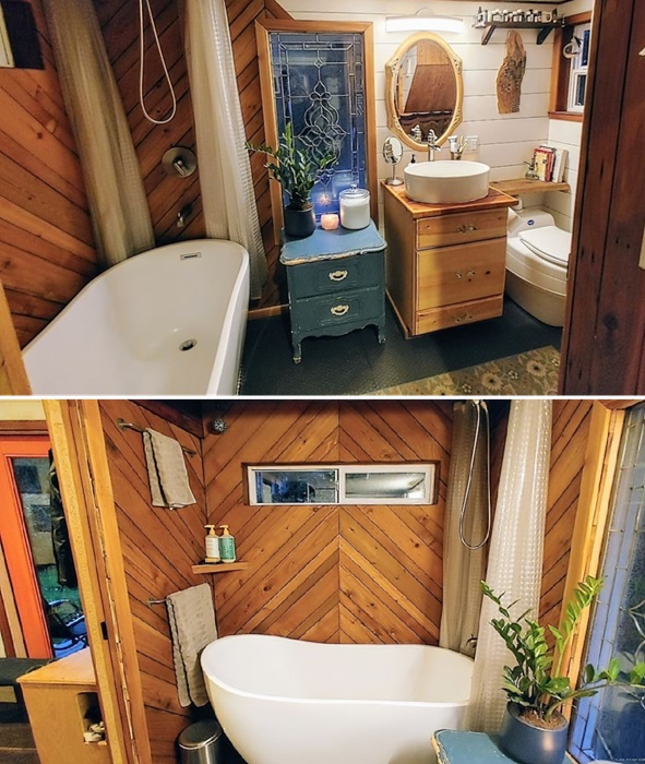Говоря о ванной комнате, которая находится с другой стороны гостиной, стоит отметить, что и она продолжает тему деревенского жанра. Деревянная стена, изготовленная из закрепленных по диагонали досок, в сочетании с полноразмерной акриловой ванной создает теплое, уютное пространство, идеально подходящее для максимального расслабления во время приема водных процедур. Раритетный туалетный столик с потертостями, овальное зеркало в деревянной раме и эффектный витраж из свинцового стекла добавляют винтажный колорит дизайну. В то же время керамическая раковина и компостный туалет предлагают современную функциональность и обеспечивают необходимым минимумом удобств.