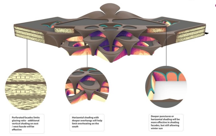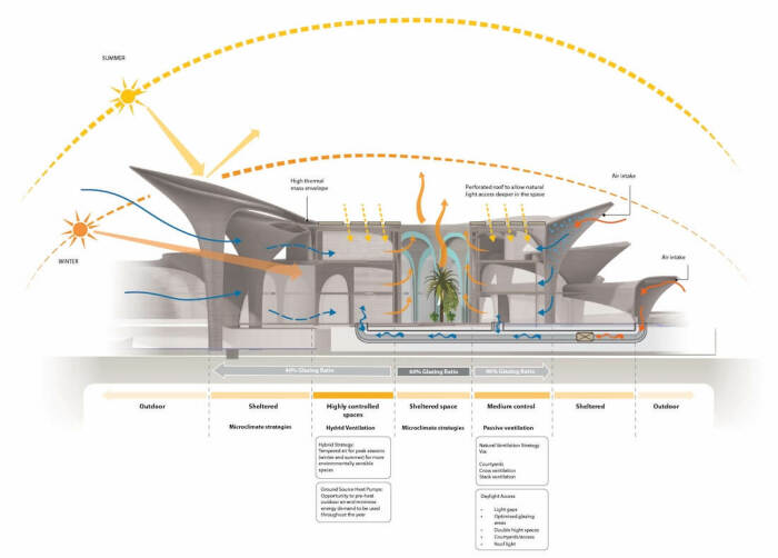 Хотя без использования ультрасовременных жизнеобеспечивающих систем также не обошлось. Их часть направлена на управление и координацию естественных процессов. Согласно представленному концепту, в полых арках, имеющих потрясающую конфигурацию, достигнутую с помощью параметрического проектирования, планируют установить мощные вентиляторы и туманогенераторы, которые в самую жаркую пору или безветренную погоду помогут охлаждению. Их расположение перед выходом воздуха внутрь помещений позволит более эффективно справляться с высокими температурами и сухостью воздуха.