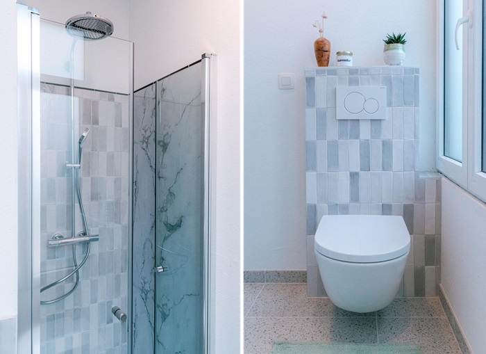 Ванная комната в этом крошечном доме небольшая, но предлагает уединенную и комфортную обстановку. Грамотное проектирование позволило вместить все необходимое для удовлетворения санитарных потребностей семьи или отдыхающих. Полноразмерная душевая кабина, облицованная керамической плиткой под мрамор и огражденная стеклом, небольшая раковина и смывной унитаз скрываются за раздвижной дверью, никому не мешая.