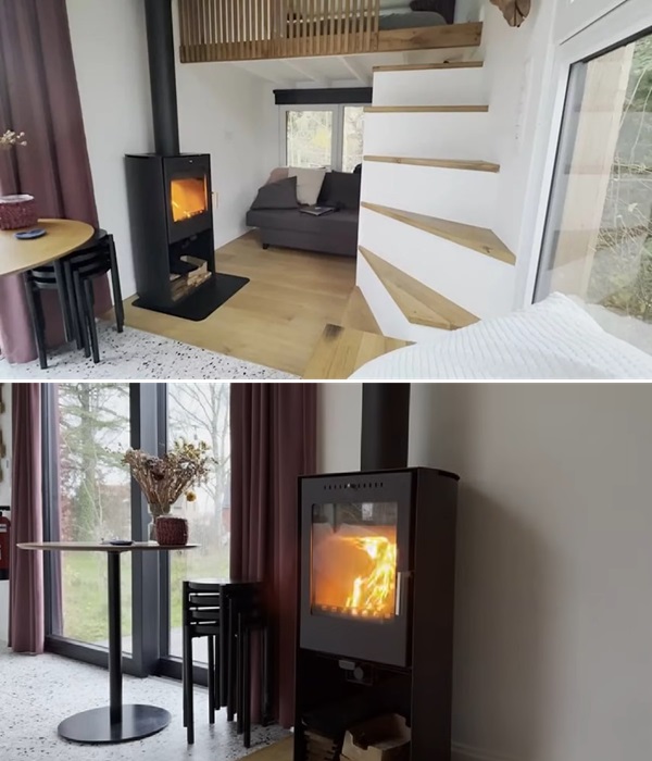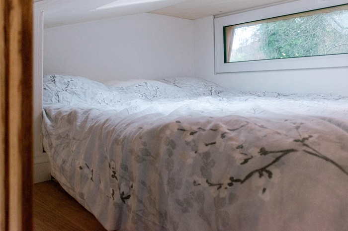 Благодаря асимметричной форме и выступающей вверх части, в крошечном доме имеется отдельная спальня, куда можно попасть по изящной лестнице, которую Андреас мастерски спроектировал и изготовил, чтобы она занимала как можно меньше места, но при этом была максимально удобной и функциональной. Учитывая скромную высоту, спальня имеет низкий потолок, что не позволяет пройтись в полный рост, но выспаться и максимально расслабиться точно получится. Несмотря на ограниченность высоты она довольно просторная и уютная, а большое окно и деревянные перила, делают ее открытой и воздушной.
