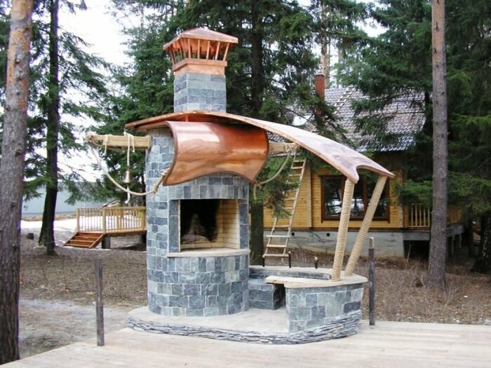 Модели бывают разными, с разнообразным дизайном, отлично вписывающимся в ландшафт участка. В некоторых комплексах предусмотрены столы и скамейки, а также столешница, чтобы нарезать овощи или мясо, а также полки для посуды. Обычно они топятся на углях и дровах, долго удерживают тепло и могут обогревать в холодное время.