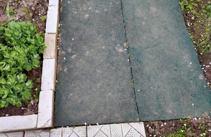 Несмотря на то, что рубероид является доступным материалом и выглядит достаточно прочным, он совсем не подходит для создания садовых дорожек. Он предназначен в первую очередь для гидроизоляции крыши или других конструкций. А вот если уложить его на землю, то он начнёт очень быстро разлагаться под воздействием солнечного света и осадков, таких как дождь и снег. От сухости он может трескаться и рваться, это будет выглядеть крайне некрасиво. Рубероид — совсем не надёжный выбор, потому что на его поверхности будут скапливаться лужи, к тому же из-за составляющих рубероида он начнёт прилипать к обуви, оставлять чёрные следы по всему участку или дому. И уже к следующему сезону от такой дорожки совсем ничего не останется.