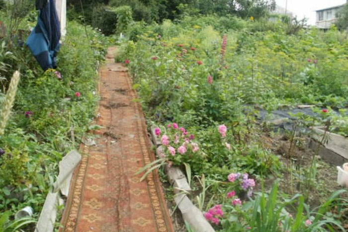 Есть много советов о том, как для украшения дорожек на них укладывают длинные паласы и ковры. Конечно, это имеет место быть не только под навесом, и то такой материал не продержится долго. Однако, для теплиц он вполне подойдёт, также его можно положить в беседке или на летней кухне, но для использования на дорожках идея не самая лучшая. И хотя они легко моются и ходить по ним мягко, под открытым небом они быстро пачкаются и истираются, выгорают и начинают гнить из-за постоянной влажности. К тому же накапливают воду, на них может начать расти мох, и ходить в шлёпанцах по такому мокрому паласу будет некомфортно. Такой материал не может обеспечить создание ровной поверхности и все кочки и неровности земли будут чувствоваться под ботинками.