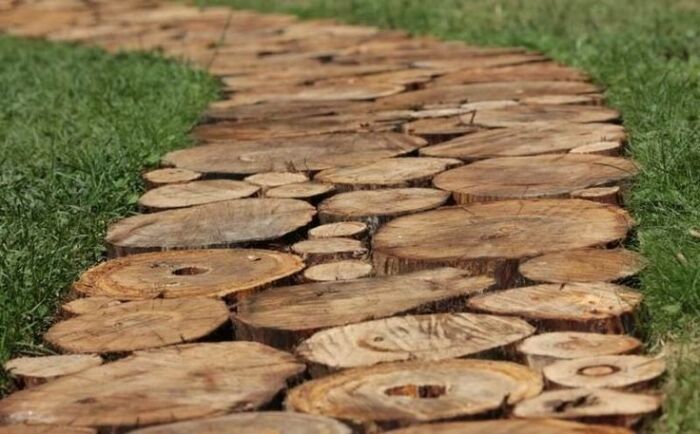 Очень красиво, без сомнения, выглядят натуральные дорожки из спилов деревьев. Очень экологично, красиво и эстетично, весь сад можно будет украшать под стать таким лесным, сказочным тропинкам. Однако, на практике такое решение имеет много недостатков. Самая основная проблема заключается в том, что древесина гниёт, и особенно сильно под обильным воздействием влаги. А садовые дорожки от неё никак не защитить, особенно зимой. В свою очередь, на такой гниющей древесине образуется грибок и появляется много насекомых. Дорожки начинают темнеть и терять свою эстетическую привлекательность. И хоть это не самый дорогостоящий способ, укладывать пеньки — тоже дело не из простых. Если всё же желание уложить такие пеньки слишком велико, нужно использовать исключительно специально обработанную древесину, в ином случае дорожки не продержатся и пяти лет.