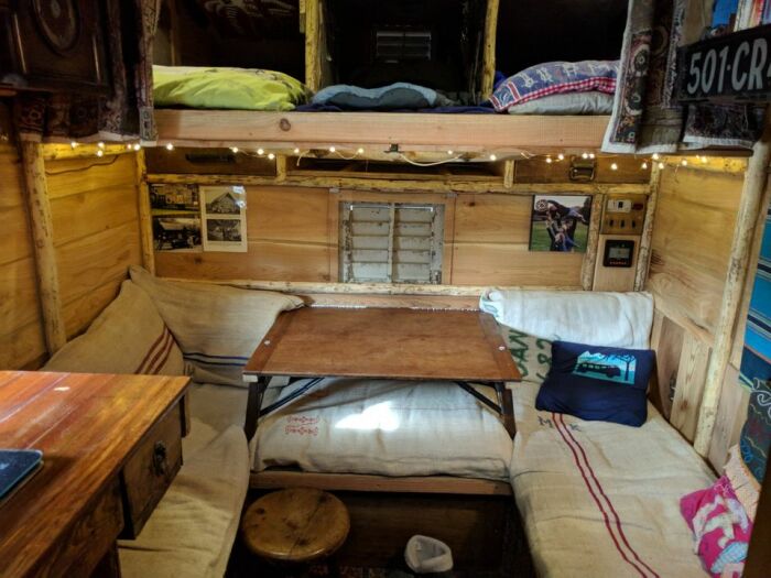 Как оказалось, даже на небольшом «пятачке» есть возможность устроить застолье на пятерых человек и столько же людей будут обеспечены спальными местами. Благодаря небольшой надстройке, нависающей над кабиной, и чуть приподнятой крыше в этой части домика, удалось сделать миниатюрный чердак, где предусмотрено одно спальное место. Остальным же придется устраиваться на ночлег в тесной компании (в прямом смысле слова), поскольку лавки-диваны с мягкими матрасами заодно являются и односпальными кроватями. Центральная же часть, где опускается столик, становясь опорной конструкцией для матраса, выступает в роли двуспальной кровати.