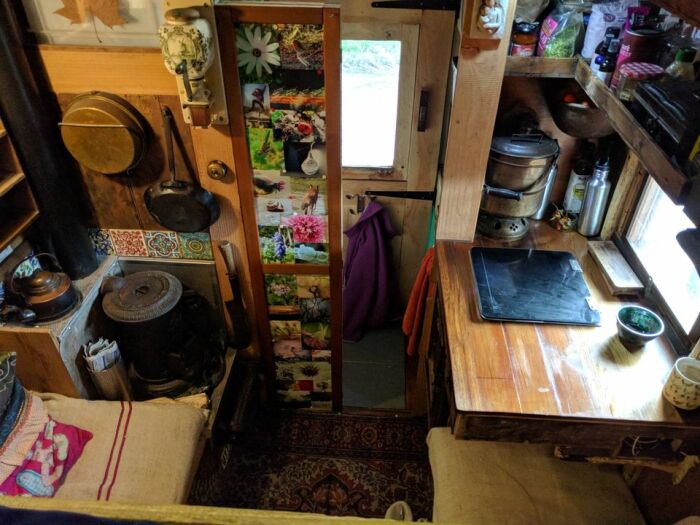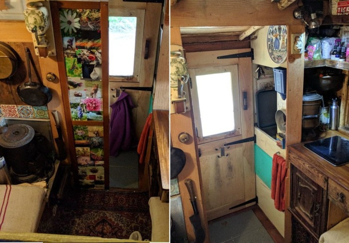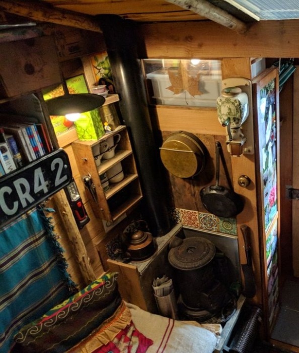Несмотря на значительные ограничения, имеющегося пространства хватило для организации миниатюрного, но все же жилища. Продолжая деревенскую эстетику 30-х годов прошлого века, интерьер можно считать устаревшим, но не обделенным шармом и колоритом. Каждая деталь, будь-то облицовочные материалы, деревянные предметы мебели, кухонная утварь или дровяная печь Charles Portway & Son Halstead Essex «Tortoise» No. 0., которая вообще является уникальнейшим экспонатом, – все они имеют свою историю, при этом обрели новую жизнь. Раритетные детали создают особенную атмосферу, одним она навевает ностальгические воспоминания, молодое же поколение такая обстановка привлекает нетривиальностью и запоминающимися впечатлениями.