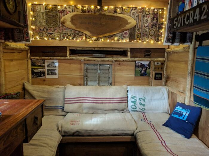 Учитывая, что переоборудованием, точнее, строительством с нуля, занимался плотник неудивительно, что главным материалом стало дерево. Мастер использовал старые массивные доски, поскольку они лучше всего соответствовали облику потрепанного грузовика, кабина которого осталась в неизменном виде. Кузов же стал основанием для установки деревянного каркаса и дальнейшего строительства совсем крошечного домика. А все потому, что старые грузовики Citroen D850 являлись облегченными версиями и кузовная часть небольших размеров. Хотя даже ее он решил разделить между жилым пространством и крошечной террасой, которая является заодно и крыльцом, местом для хранения.