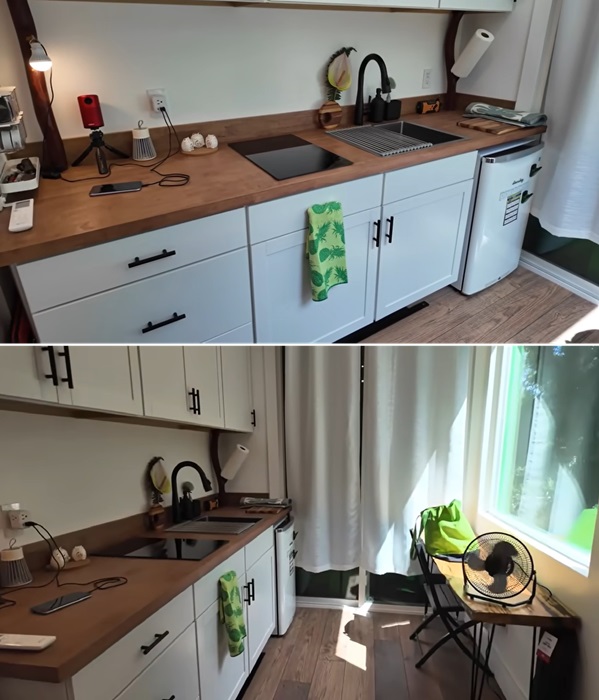 Значительную часть пространства была выделена под обустройство кухни, в которой есть все благодаря современному мебельному гарнитуру. Наличие вместительных тумб, шкафов и полноразмерной столешницы, делают кухонный уголок вполне функциональным и привлекательным, поскольку есть возможность избежать нагромождений посуды, бытовой техники и гаджетов, спрятав их с глаз в закрывающиеся шкафы. В этой части находится мобильный обеденный стол, что дает возможность его перемещать и использовать для разных целей в любом месте крошечного дома, включая террасу.