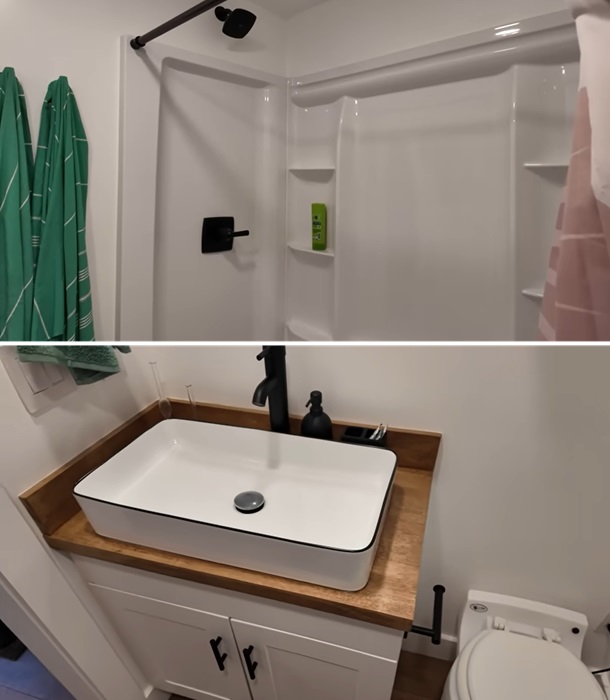 Ванная комната оказалась на удивление просторной (как для такого типа жилья). Здесь поместились: полноразмерная душевая кабина, туалетный столик, дизайн которого соответствует стилю кухонных шкафов, полноценная керамическая раковина, биотуалет. Чтобы избежать ощущения нахождения в трейлере, Брэнда добавила «парящие» полки для хранения моющих и косметических принадлежностей. На них она установила живые цветы, а душ прикрыла яркой водонепроницаемой шторкой с принтом на природную тематику. Благодаря этим штрихам интерьер ванной комнаты получился более домашним и «живым».