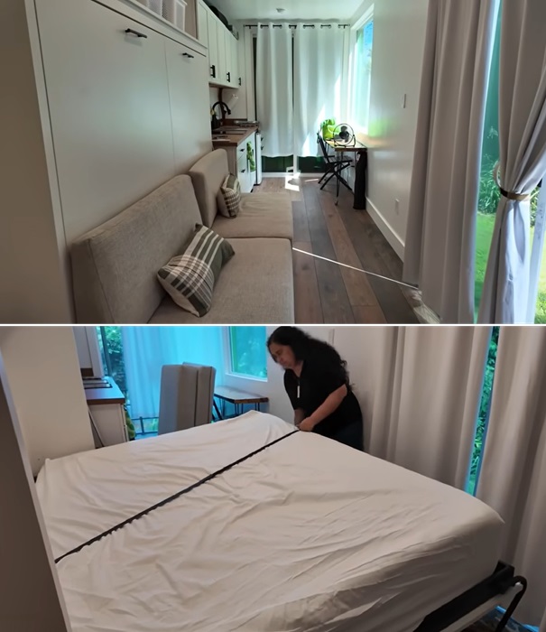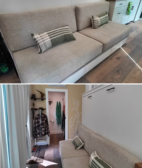 Центр крошечного жилища – многоцелевое пространство, где оборудована гостиная и спальня. Это стало возможным благодаря установке полноразмерного дивана со встроенными ящиками для хранения и подъемной кровати Мерфи, прекрасно экономящей место в дневное время. Вместо шкафа женщина решила использовать вешалку и несколько полок. Они располагаются у входа в ванную комнату и совсем не мешают, когда Брэнда опускает кровать, готовясь ко сну.