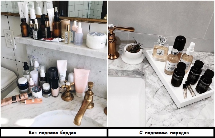 Подносы сделают интерьер более опрятным, изысканным, стильным, а также существенно облегчат уборку, так как вам не придется снимать с раковины десять бутылочек, чтобы протереть ее от влаги и грязи – достаточно будет лишь убрать один поднос. При выборе изделия обращайте внимание на цвет, фактуру, материал, форму – важно, чтобы оно вписалось в интерьер ванной комнаты. Возможно, поднос даже станет акцентом.