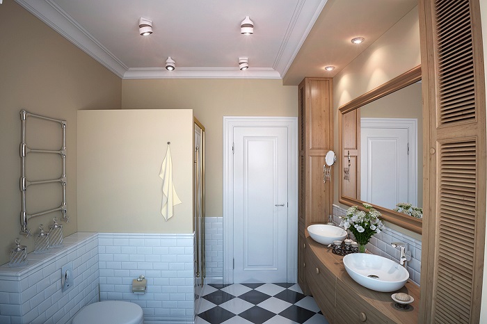 Даже если комната маленькая, одна люстра в центре потолка не сможет достаточно осветить ее. Чтобы в ванной не оставалось ни единого темного уголка, и вы могли регулировать освещение при желании, добавьте несколько светильников и расположите их на разных уровнях. Если все сделать правильно, источники света смогут подчеркнуть текстуру стен, пола, мебели. После такого апгрейда вы сразу заметите, как изменилось помещение, насколько просторным и роскошным оно стало. Кроме того, с помощью светильников можно разделить комнату на функциональные зоны, например, выделить раковину, душевую, место для стирки и пр.