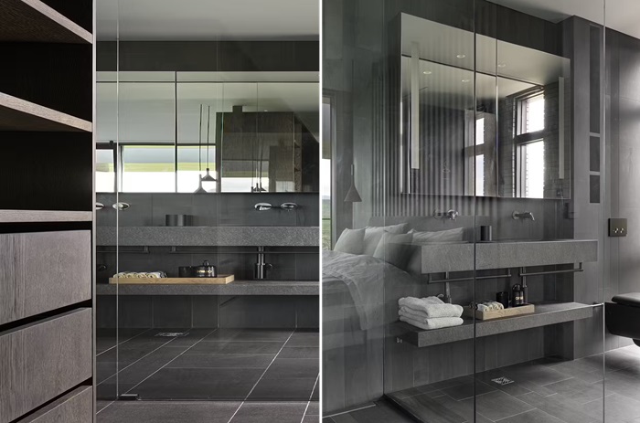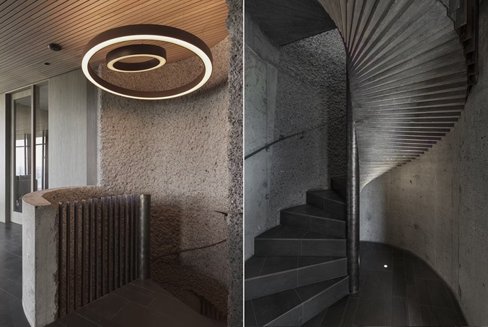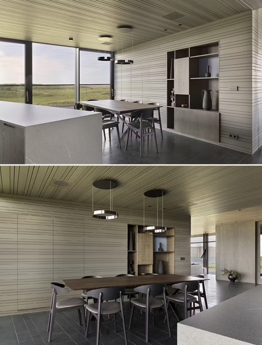 Кстати сказать, такого же плана древесина использовалась и для оформления внутреннего пространства, что создает ощущение непрерывности между интерьером и экстерьером. Стены помещений в жилом пространстве облицованы шпоном сосны, который также обработан то той же технологии, что и кеноби. А вот в мокрой зоне, в ванных комнатах и на кухне, для отделки использовали исландский голубой камень (Blágrýti), что еще больше усиливает связь между жилым пространством и окружающим ландшафтом.