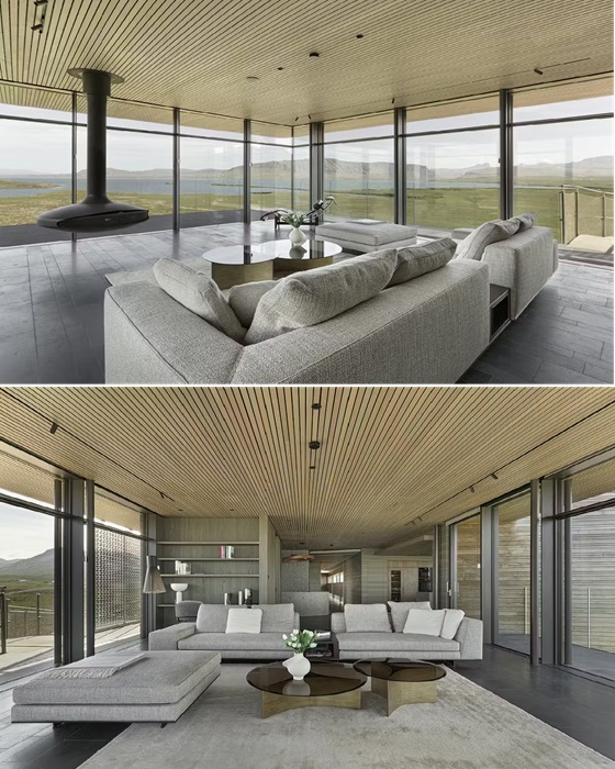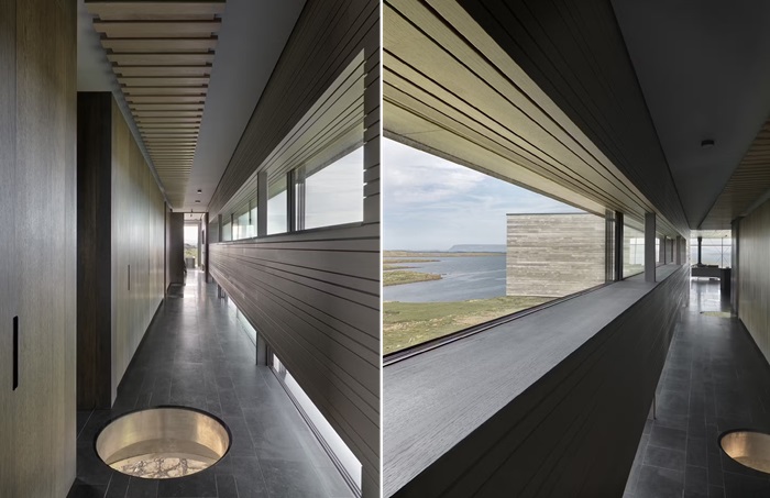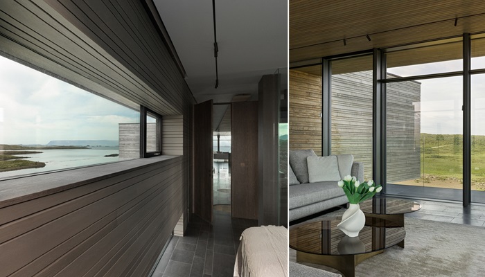 Чтобы в полной мере владельцы и гости смогли насладиться красотой каждого уголка живописной панорамы, разработчики предусмотрели масштабное остекление. И если в некоторых более уединенных пространствах или коридорах отдали предпочтение ленточному остеклению, а не полностью открыли стены, в них от этого не стало темнее. Да и обзор не оказался закрытым. Окна расположены так, что малейшее изменение в природном окружении, гость в виде птиц или диких зверей не останутся не замеченными. А все потому, что довольно узкая ширина здания позволила организовать максимально открытые пространства, чтобы жильцы смогли бесконечно наслаждаться красотой исландской тундры и видами на ближайший фьорд.