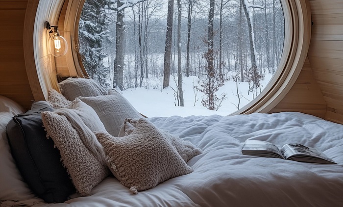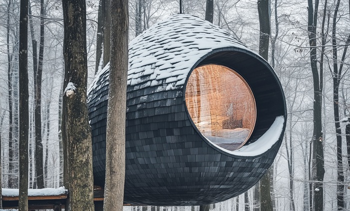 Главными структурными элементами каждого домика из коллекции The Burl являются круглые окна и двери, придающие их облику дополнительное очарование и более сказочный образ. Они наполняют жилое пространство светом и открывают панорамный вид на окружающий лес. Стоит отметить, что дизайн интерьера контрастирует с экстерьером и выполнен он из светлого кедра или ясеня, что с круглыми окнами и нестандартной дверью делает небольшое убежище более уютным и расслабляющим.