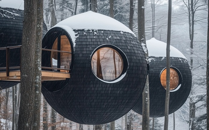 Стоить отметить, что соединительные конструкции превращены в подвесные мосты, по которым можно переходить из одного домика в другой, не спускаясь на землю. Это внедрение добавляет дозу острых ощущений отдыхающим. Положительным моментом является и то, что домики подвешены. Мало того, что такой подход к строительству защищает экосистему, он позволил превратить оригинальные капсулы в «парящие» сферы, больше напоминающие гнезда тех птиц, которые вьют их подобным образом. Этому поспособствовала органичная форма капсул, покрытых кедровой черепицей, обожженной по старинной японской технологии shou sugi ban. Она превращает древесину в черный цвет и делает ее более устойчивой к климатическим и погодным условиям, а также предохраняет от насекомых.