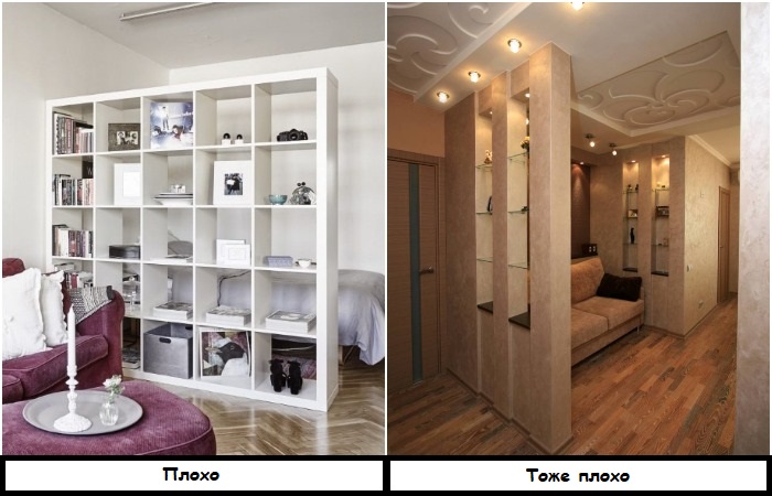 Стеллаж и перегородка из гипсокартона не подходят для зонирования маленькой комнаты