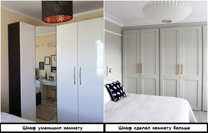 Также стоит отказаться от невысоких шкафов. Иногда кажется, что это самый лучший вариант, особенно если модель глубокая, но нет –для обустройства маленькой комнаты гораздо лучше подходит более высокая и узкая мебель. Советуем отдать предпочтение лаконичному шкафу в цвет стен высотой под потолок. На самой верхней полке можно будет хранить сезонную одежду и декор, а также другие редко используемые вещи. Визуально шкаф будет выглядеть как продолжение стены и не станет перегружать комнату. Отличная идея – повесить на дверцы зеркало, чтобы оно зрительно увеличивало помещение.