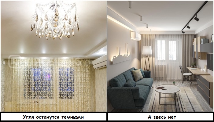 В советских интерьерах массивные, объемные люстры были очень актуальны. Они обращали на себя внимание и задавали комнате настроение. Наверное, именно поэтому многие решили перенести подобный светильник в современную обстановку, чтобы он был акцентом. Однако в случае с маленькой квартирой это не слишком удачное решение, так как все достоинства крупной, привлекательной люстры сведутся на нет. Она визуально опустит потолок, сделает помещение маленьким и тесным, будет давить. Кроме того, когда люстра светит сверху, углы остаются в тени, что также негативно сказывается на восприятии пространства. Гораздо лучше для оформления малогабаритки подойдут различные световые композиции по всему периметру комнаты, которые расширяет помещение, а также скорректируют его пропорции.