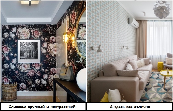 Если узор – то лаконичный и не слишком контрастный В последнее время в моду входят обои с крупным узором, но их лучше использовать для оформления просторных комнат. А вот в случае с крохотными помещениями, они будут лишь во вред, так как лишний раз привлекут внимание к истинному размеру комнаты. Для небольших пространств лучше выбирать однотонные обои или с мелким, не слишком контрастным принтом. Оттенок больше подойдет холодный, так как теплые тона визуально приближают предметы, а холодные, наоборот, отдаляют.
