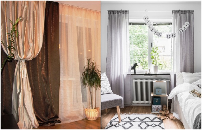 Красивые, объемные шторы из качественной натуральной ткани станут отличным дополнением просторного интерьера, где вы сможете любоваться ими на расстоянии. Но в случае с маленькими комнатами это не самый лучший вариант. Тяжелые портьеры привлекут слишком много внимания, визуально опустят потолки и сузят пространство. Дизайнеры рекомендуют заменить из легким, невесомым тюлем или полупрозрачными шторами светлых оттенков, которые будут смотреться воздушно и не перегрузят помещение. А если вы не боитесь назойливых взглядов соседей или света фонарей с улицы, можете взять пример со скандинавов и вообще отказаться от штор – тогда комната постоянно будет залита естественным светом.