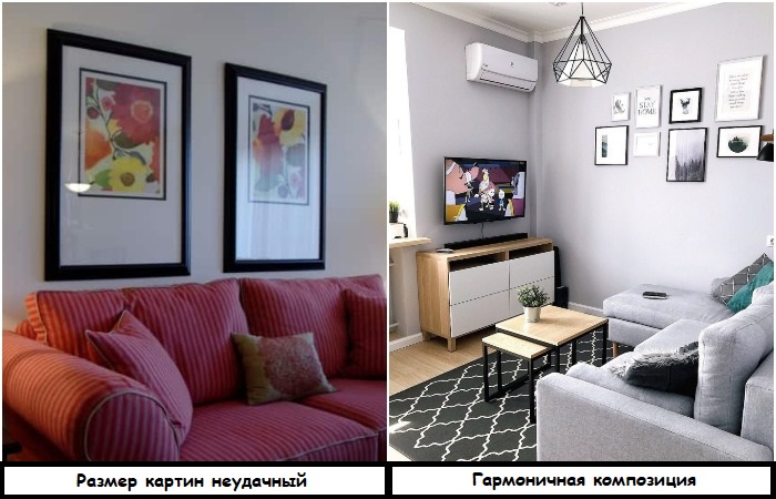 Сразу откажитесь от идеи вешать тяжелые, крупные картины в массивных рамах. На такие полотна следует любоваться издалека, в этом случае они действительно будут украшать интерьер. А вот в маленькой комнате не получится так сделать, поэтому картина будет работать от обратного – визуально «схлопывать» помещение. Вместо больших полотен составьте стильную композицию из маленьких рамой с постерами, картинами или семейными фотографиями.