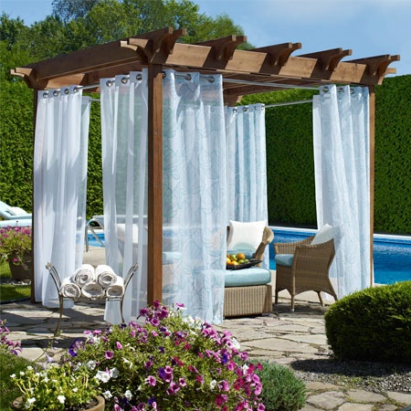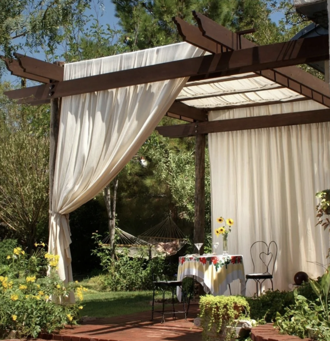 Пергола, несмотря на то, что не полностью закрывает от солнечного света из-за особенностей конструкции тоже может стать отличным навесом. Поверх неё можно пустить дикий виноград, клематисы, лозу, розы или плющ, который со временем превратит перголу в настоящую беседку, создав ей живую крышу. Это добавит тени и прохлады. Для того чтобы соорудить перголу самому, потребуется древесина, обычно такая конструкция выполняется из неё. Подойдут дуб, лиственница или сосна, это могут быть планки или тонкие доски. А также хороший брус для основного каркаса. И много украшений в виде гирлянд и фонариков. Под ней получится организовать потрясающую зону отдыха, установить садовую мебель из ротанга или деревянные лавочки и скамейки.