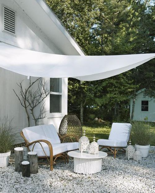 Крепления должны быть прочными, чтобы ткань не сорвало от сильного ветра, а вырезанные под канаты дырки, на которых он и крепиться, лучше обрамить железными кольцами для долгой эксплуатации. Лучше закрепить ткань под углом, чтобы в ней не скапливалась дождевая вода. Также можно добавить легкие тканевые тюли для создания большего уюта и приватности. Такой навес можно легко снять и постирать или убрать на зимний период при необходимости. Тканевый навес может быть и вполне мобильным решением, опоры не нужно вкапывать глубоко в землю. И подойдёт для пикников, вечеринок и просто отдыха в той части участка, где захочется. Можно установить его над зоной барбекю, детской песочницей или даже над автомобилем. Затраты на его строительство низкие, ставить его достаточно быстро, а конструкция не будет тяжелой, это основные его плюсы.