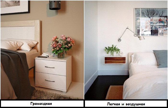 Когда речь заходит об обустройстве спальни, некоторые решения приходят в голову на автомате: шкаф, кровать, прикроватные тумбы по бокам. Но если первые два варианта еще можно вписать в небольшую комнату, то вот тумбы там явно лишние. Во-первых, если предметы расположены впритык между кроватью и стенами, они будут визуально уменьшать пространство. А во-вторых, существенно ограничивать удобство передвижения по комнате, так как вы постоянно будете спотыкаться об них. Кроме того, тумбы выглядят скучно и банально, будто в обычном номере отеля, да и с точки зрения хранения являются не слишком функциональными.
