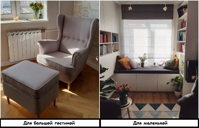 Чтобы не допускать таких ошибок, проанализируйте, кто как проводит свой досуг, и сколько человек одновременно отдыхает в гостиной. Возможно, всем будет удобно на диване и дополнительное место для сидения не потребуется. Кстати, отличная идея – купить несколько напольных подушек и размещаться там, как это делают в восточных странах. Или сделать зону отдыха из подоконника.