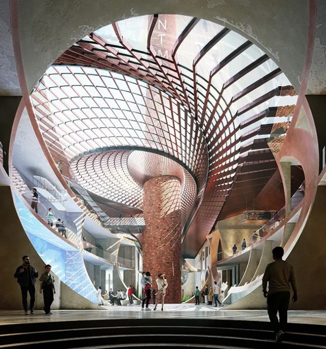 Впечатляющий атриум появится вокруг основания трубы (рендеринг Музея Николы Теслы). | Фото: zaha-hadid.com.