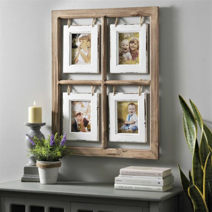 Интересная, практичная и модная идея — это создание фоторамки из старых окон. Такой способ не только поможет сохранить важные воспоминания, но и любоваться на них каждый день, потому что будет всегда в зоне видимости на стене, а не в фотоальбоме на полке. К тому же это очень красивый и стильный элемент декора, где нет ничего лишнего. Фотографии можно разложить в хаотичном порядке или сделать для каждой свой отсек. Это может быть одна большая фотография или несколько маленьких, всё зависит от размера рамы и количества перегородок в ней. Если в раме осталось стекло, его лучше также сохранить, чтобы фотографии меньше выцветали и не пылились. Фото можно приклеить на клей или двухсторонний скотч, а саму получившуюся рамку тоже нужно очень надёжно закрепить на стене, она достаточно тяжёлая. А можно просто оставить её на полке, на полу или столе, в зависимости от размера.