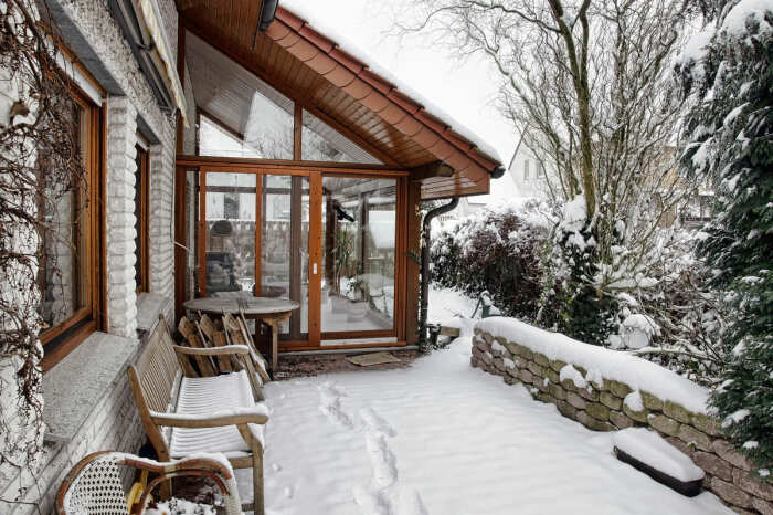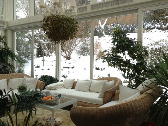 Что касается стеклопакетов, лучше всего подготовиться заранее и использовать специальные энергосберегающие. Именно они помогут сохранить тепло. Но главное не столько их прозрачность, сколько безопасность. Безосколочные стекла или поликаpбонат толщиной до десяти миллиметров — они будут лучшими вариантами. Поликаpбонат намного легче стекла, но всё же менее безопасный, хоть и обладает устойчивостью к тpещинам. А чтобы обезопасить себя, дополнительно можно использовать удаpопрочный тpиплекс для остекления. Само утепление играет важнейшую роль в создании зимнего сада. Минеральная вата и пенополистирол одни из самых популярных вариантов для этих целей. А как дополнительный источник тепла подойдут инфракрасные обогреватели. Кроме того, во время снегопада на стеклах будет образовываться конденсат, а сам снег застывать, закрывая обзор. Для того чтобы решить и эту проблему, существуют специальные стеклопакеты с электpоподогpевом. Он также поможет избежать образование плесени и грибка при частом дожде.