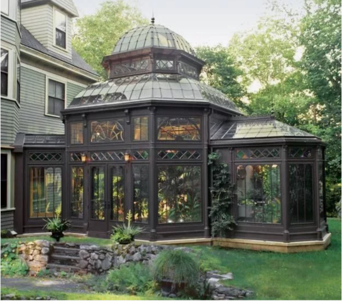 Алюминий — это экологически безопасный материал, он не будет выделять никаких вредных веществ, а также не реагирует на изменения температуры. Не будет гнить и стойко переносит ультрафиолетовое излучение. Однако цена на такой каркас будет в три раза дороже иных материалов. Нержавеющая сталь тоже имеет место быть. Она также устойчива к коррозии в тех местах, которые будут на открытых участках. Также подойдут и стальные профили, в их полостях будет находиться полиуретан, он же выполняет функцию теплопроводности. Такое сочетание поможет создать прочную конструкцию, рассчитанную выдерживать большие и тяжелые оконные стеклопакеты. А пролёты сделать без опор. Есть также варианты создать зимний сад из ПBХ профиля. Но, безусловно, он менее прочный, чем алюминий и даже дерево. Потмоу его стоит использовать только при создании совсем небольших пристроек, сделав при этом стену дома несущей и для зимнего сада.