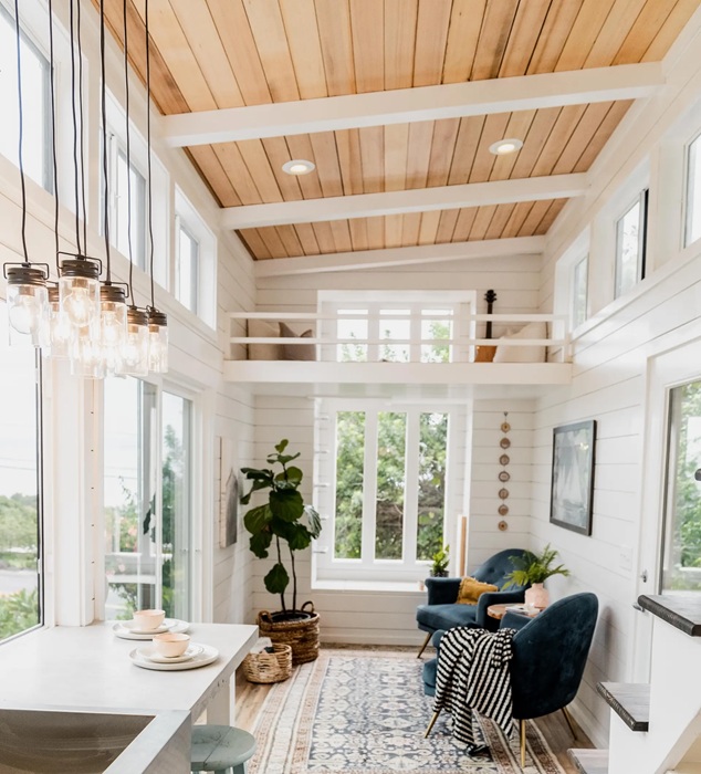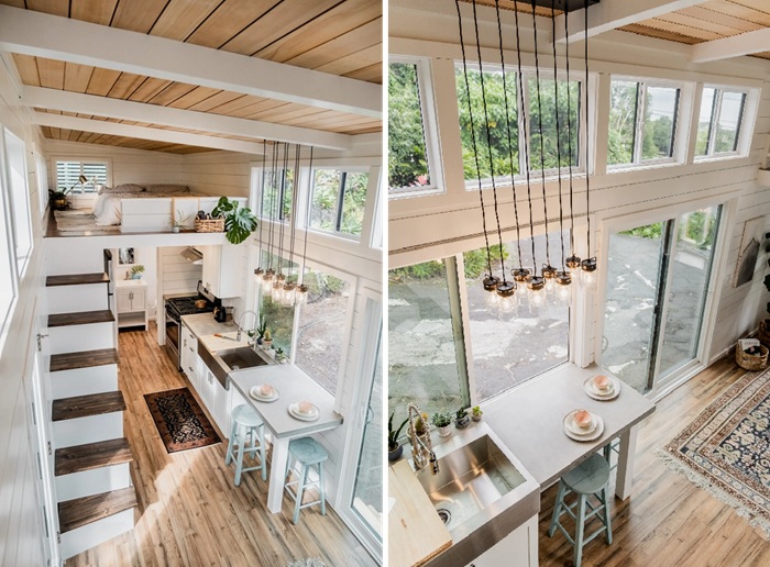 Учитывая, что дом строился на стандартной раме трейлера, его ширина предопределила планировку. С шириной внутреннего пространства около 2,4 метра не оставалось ничего другого, как линейно распределить основные жилые зоны. Также отдали предпочтение открытой планировке, причем центральная часть дома имеет двойную высоту (около 4-х метров), что в тандеме со щедрым остеклением, белоснежными стенами сделало жилище более просторным и объемным. Этому ощущению не препятствуют и два лофта, выступающих в качестве спальных зон, ведь они небольшие, а за счет белого цвета и изящных оградительных перил становятся практически незаметными.