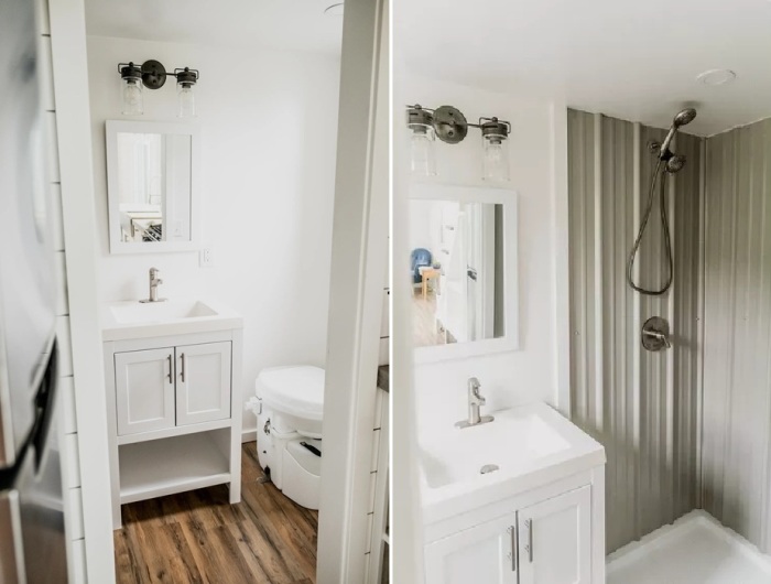 А вот над обустройством ванной комнаты пришлось немало потрудиться. Хотя она не была главным акцентом дизайна, но здесь достаточно места для принятия душа, утренних гигиенических процедур, которые упрощают тумба со встроенной раковиной и большим зеркалом. Поскольку супруги мечтали о мобильном доме, был установлен компостный туалет, хотя предусмотрена возможность подключения к центральным инженерным коммуникациям.