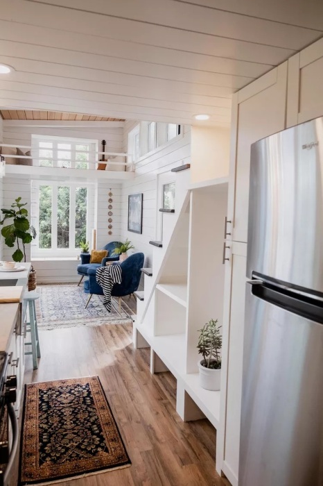 Скрытая лестница приведет на второй лофт. | Фото: tinyhouselistings.com.