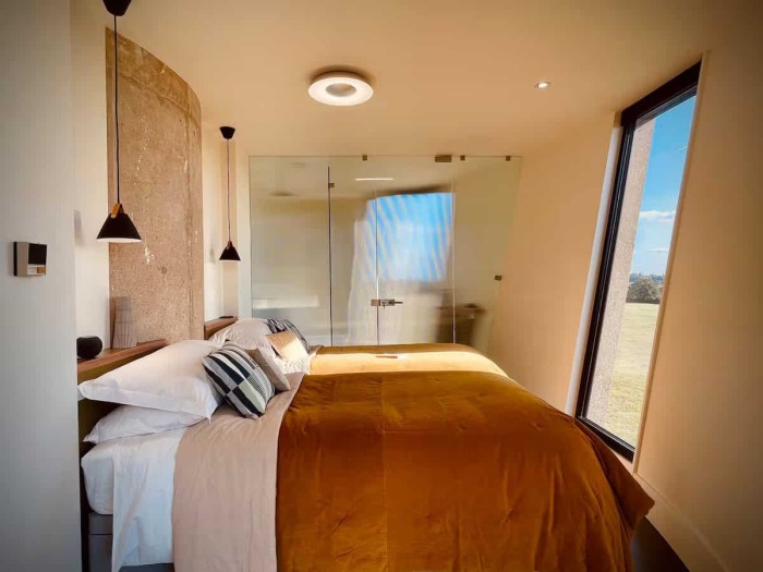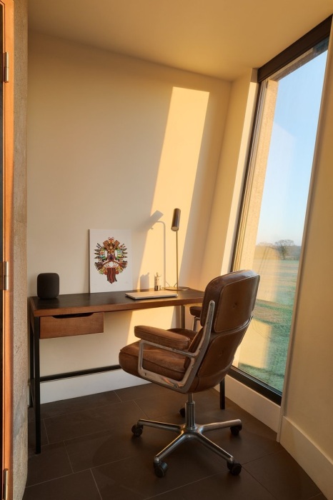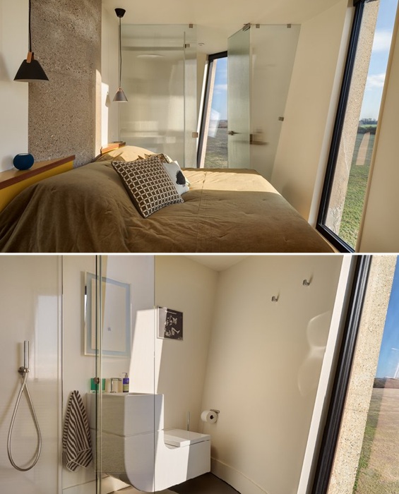 В преображенной башне удалось оформить сразу 4 максимально изолированных спальни (находятся на разных этажах), которые хоть и компактны (чем ниже, тем меньше пространство), но место для установки удобных кроватей и комодов в них все-таки нашлось. Спальные места располагаются напротив окна, чтобы не вставая с кровати, гости смогли наслаждаться идиллическими видами на живописную округу. Как и остальная часть дома, спальни спроектированы так, чтобы поддерживать комфортный микроклимат и расслабляющую атмосферу для гостей.