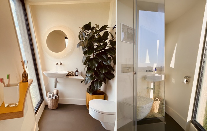 Главным удобством для постояльцев станут ванные комнаты, имеющиеся в каждой спальне. Учитывая, что эти комнаты изолированы друг от друга и от основного жилого пространства, они спрятаны за стеклянными перегородками, что придает интерьеру более современный вид. Помимо этого, на нижнем уровне оборудована прачечная со стиральной машиной и сушилкой, которыми проживающие могут пользоваться без ограничений.