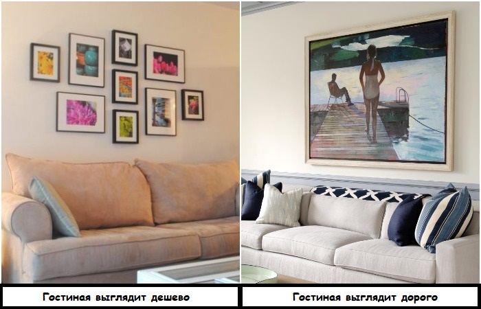 Еще один бюджетный способ декорирования стен – картины и постеры. Именно они делают пространство выразительным, добавляют ему глубины и завершенности, а иногда даже объединяют все элементы комнаты воедино. Чтобы картина действительно выглядела эффектно и привлекала внимание, отдайте предпочтение крупному полотну. Важно, чтобы оно было пропорционально мебели, стоящей рядом – кровати, дивану, комоду и пр. Цветовая палитра, стиль и сюжет зависят от ваших личных предпочтений, а также от оформления интерьера. Но дизайнеры рекомендуют уйти от шаблонных изображений, репродукций знаменитых картин, цитат про уют и мотивацию – они не украсят вашу квартиру, а, скорее, удешевят ее. Идеально вписываются в обстановку минималистичные изображения с простым или абстрактным сюжетом. Хорошо, если в них преобладает два-три оттенка, которые сочетаются с вашим интерьером. Обратите внимание на художественные черно-белые фотографии – они добавят вашей квартире определенного шарма. Также можно распечатать в типографии снимки вашей семьи или собственную работу. Важно, чтобы готовое изображение было в высоком разрешении.