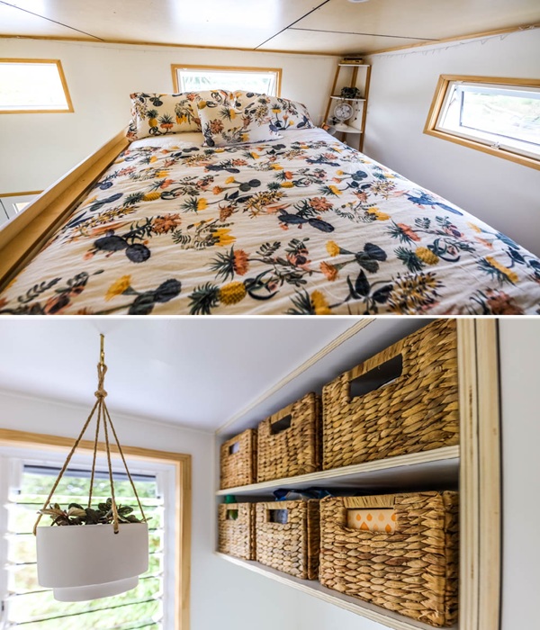 Задействована для хранения и лестница, ведущая на чердачный уровень, где девушка обустроила свою спальню. Она получилась просторной и уютной, хотя передвигаться в полный рост высокому человеку в ней не удастся. Для Хелен же она в самую пору, правда, переодеваться можно только сидя на кровати, но это мелочи, которые совсем не огорчают молодую энтузиастку крошечной жизни. В ее спальне нет полноценного шкафа, зато установлен стеллаж с открытыми полками, на которых девушка хранит свои вещи в плетеных корзинах. Учитывая стремление счастливой домовладелицы впустить природу внутрь своего убежища, неудивительно, что при строительстве она не поскупилась на окна, которые окружают ее кровать, открывая прекрасные виды на идиллический сельский пейзаж.