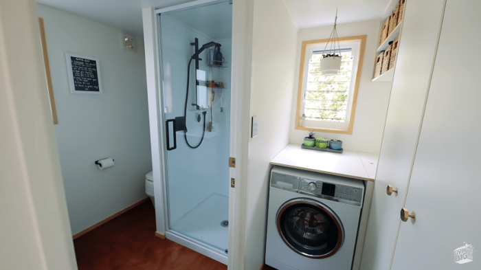 С другого конца домика находится прекрасно оборудованная ванная комната, в которую ведет коридор, где нашлось место для стиральной машины и небольшой гардеробной. В ванной установлена полноценная душевая кабина, раковина с тумбой и смывной унитаз, что можно увидеть в традиционном доме.