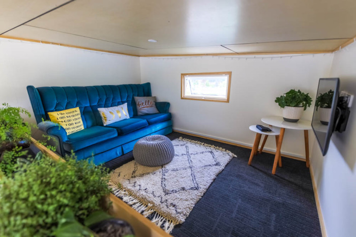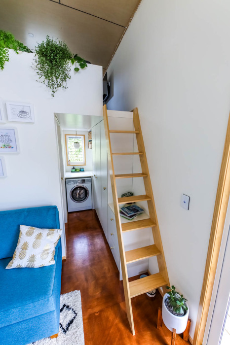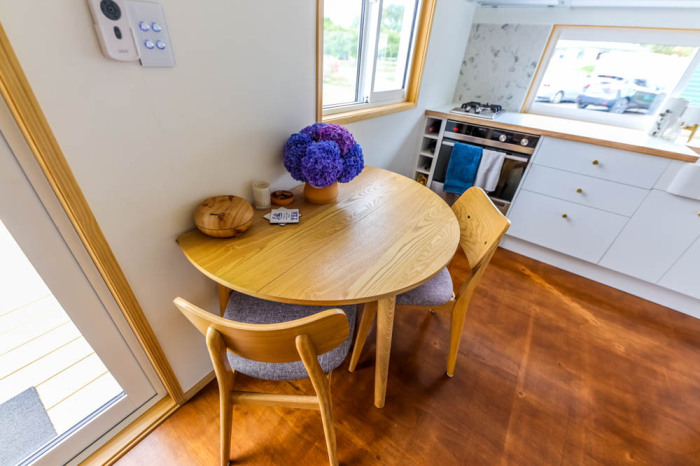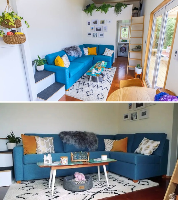 Ее домик имеет размеры 3 на 8 метров при достаточной высоте, это позволило разместить такие полезные зоны и детали, как коридор с местом для хранения одежды, обуви и аксессуаров, увеличение вместительности шкафов и тумб, обустройству столовой с полноценным обеденным столом, который можно перемещать куда понадобится. Также она отказалась от трансформирующейся мебели, чтобы ничего не казалось временным и импровизированным.