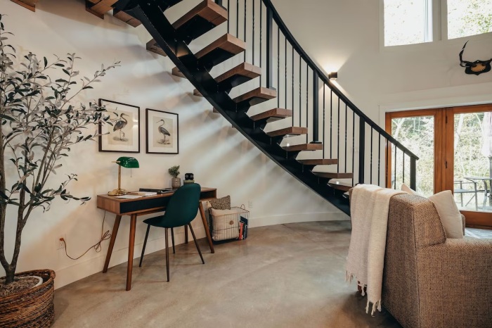 Эту часть пространства украшает изящная лестница с величественными изгибами и основательными ступенями, изготовленными из массива натурального дерева. Пространство под ней также задействовали. Вдоль закругленной стены установили рабочий стал, так что постояльцы, которым требуется постоянное участие в рабочих/организационных процессах или руководят бизнесом, имеют уединенный уголок.