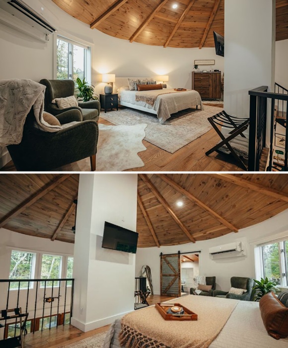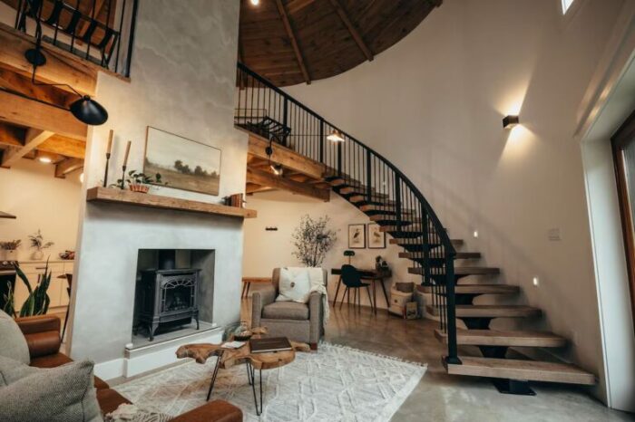 Одним из самых замечательных и впечатляющих гостевых домов стала трансформированная силосная башня, которая многие десятилетия была вместительным зернохранилищем. Прежде, чем она превратилась в комфортабельную резиденцию, семье пришлось приложить немало усилий и средств. Некоторые процессы увлеченные энтузиасты выполняли самостоятельно, используя некоторые природные материалы из своего же поместья. Для особо сложных работ приглашали специалистов, которые помогли сделать убежище теплым в зимнюю пору и прохладным летом, а также безопасным как для постояльцев, так и окружающей среды.