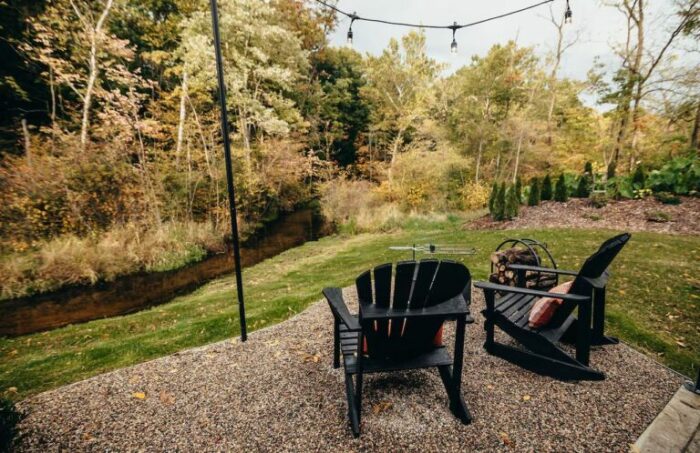 Патио возле ручья стало дополнительным бонусом для гостей (The Grain Binn, Мичиган). | Фото: homecrux.com.