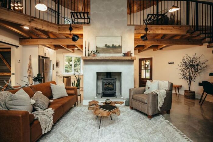 Камин с дымоходом стал разделительным элементом (The Grain Binn, Мичиган). | Фото: creeksidecabinns.com.